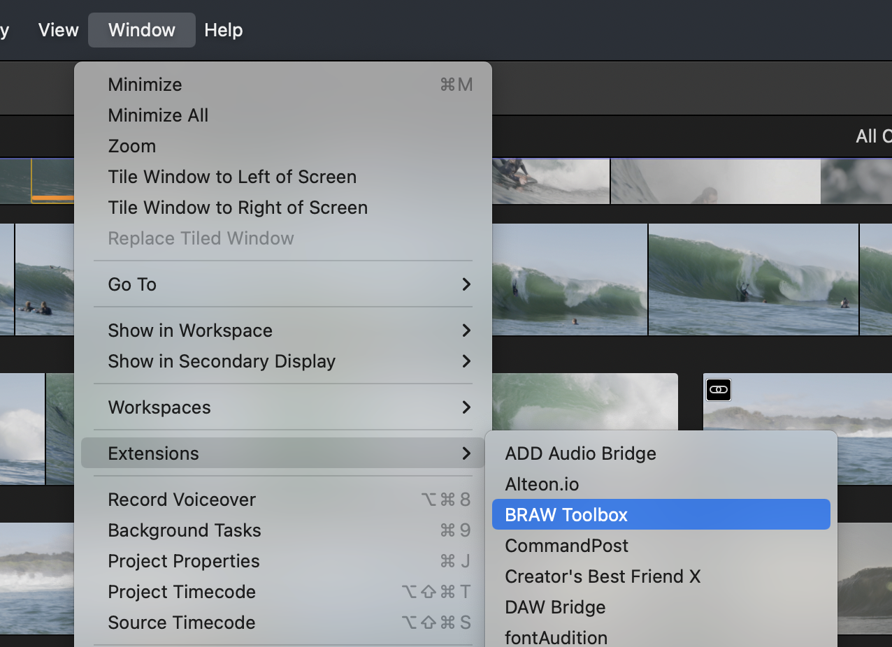 Once installed you can access BRAW Toolbox from the Workflow Extension button in Final Cut Pro: