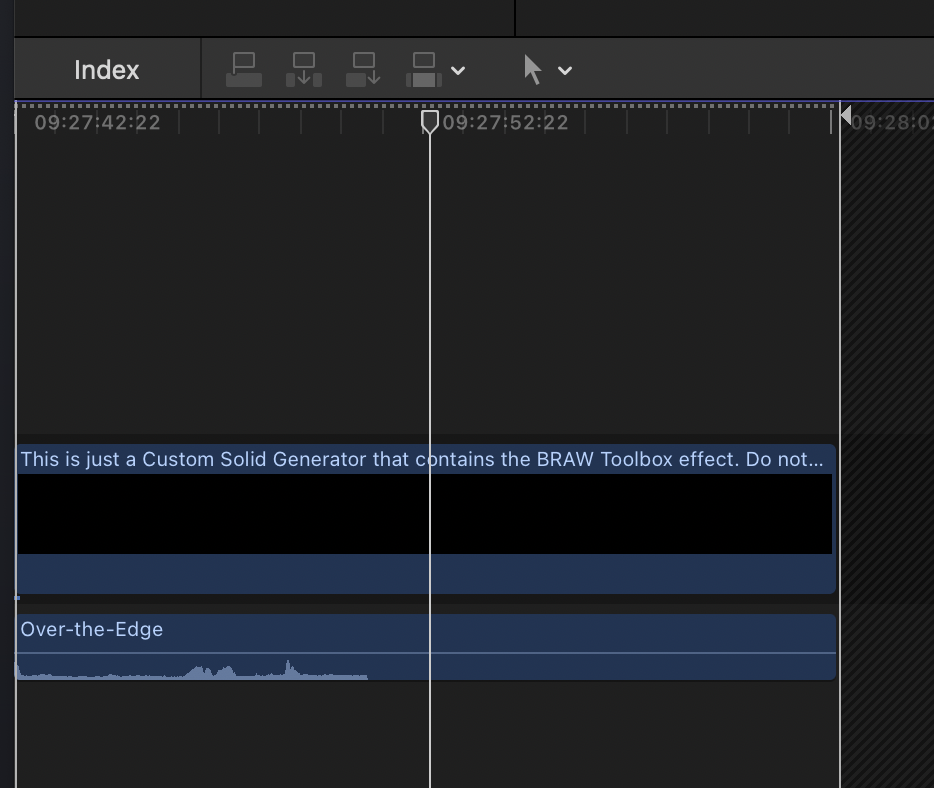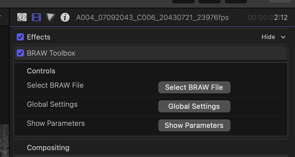 You can now click on the Black Generator on the Primary Storyline, and access the BRAW Toolbox effect in the Effects section of the Inspector: