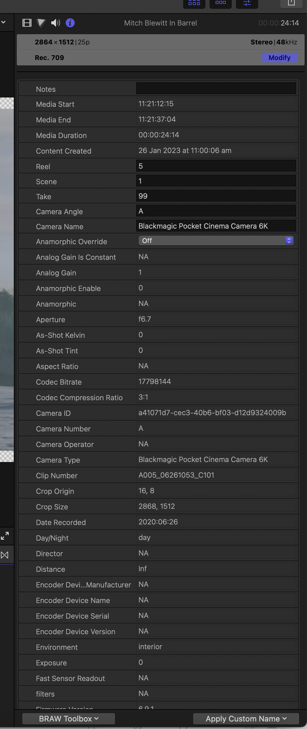 You can access it via the BRAW Toolbox Metadata View in the Info Inspector in Final Cut Pro.